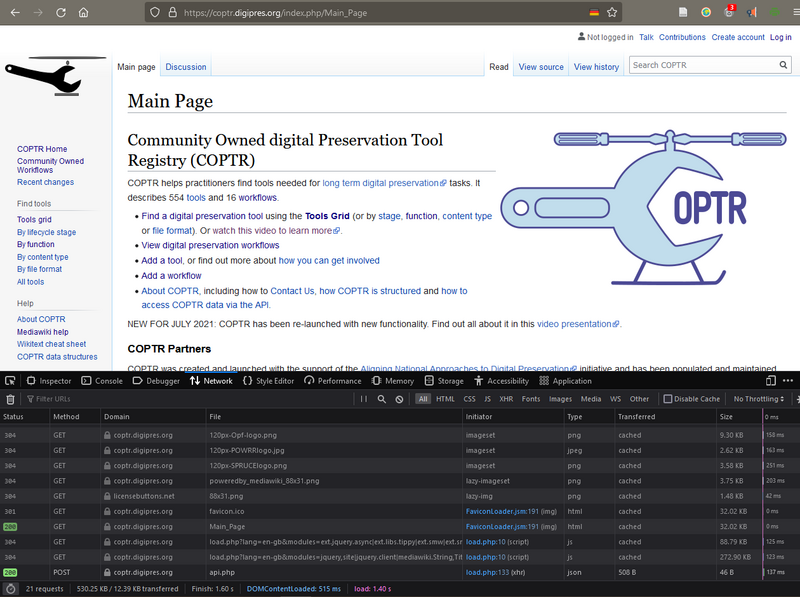 current13:17, 4 February 2022Thumbnail for version as of 13:17, 4 February 20221,260 × 940 (116 KB)EMac (talk | contribs)A screen capture of network responses displayed for the Community Owned digital Preservation Tool Registry (COPTR) wiki in the Firefox browser web developer tool (version 96.0.3).